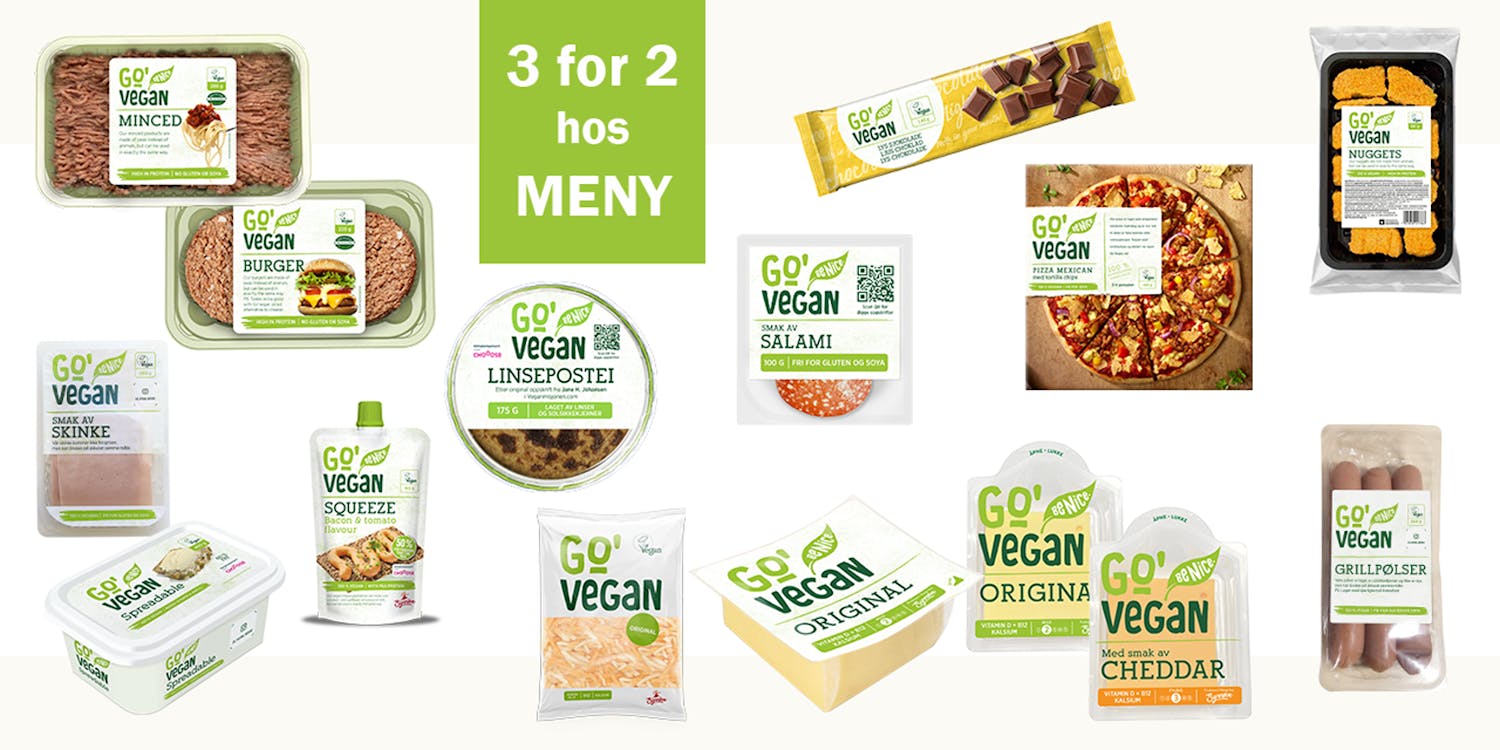 MENY har et stort utvalg varer fra Go'Vegan, og nå får du tre produkter til prisen av to - hele året! Plukk og miks dine favoritter.